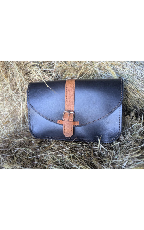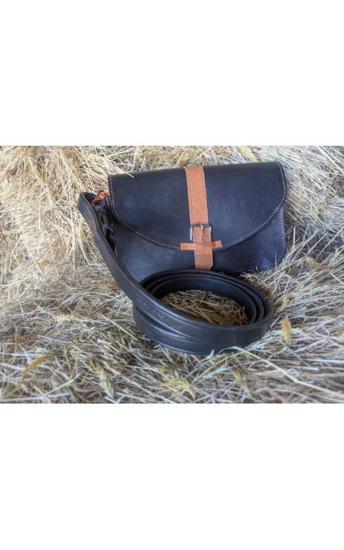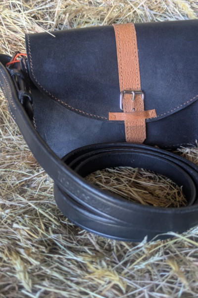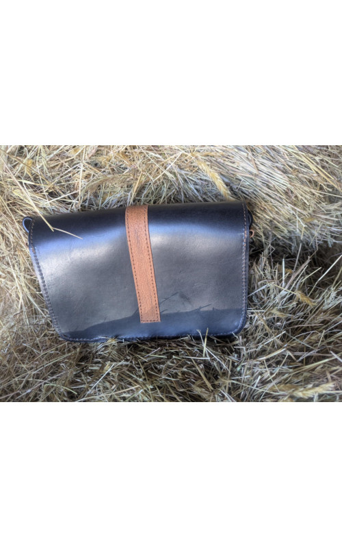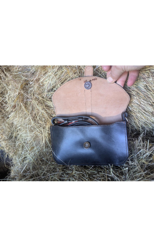 This really cute bag has been made from a gorgeously soft and sumptuous black leather, with a tan strap made from repurposed saddle leather. The bag is small and neat, perfect for a phone, a small purse and your lippy. Closing with a magnet under the buckle. the shoulder strap was once a preloved martingale neck strap