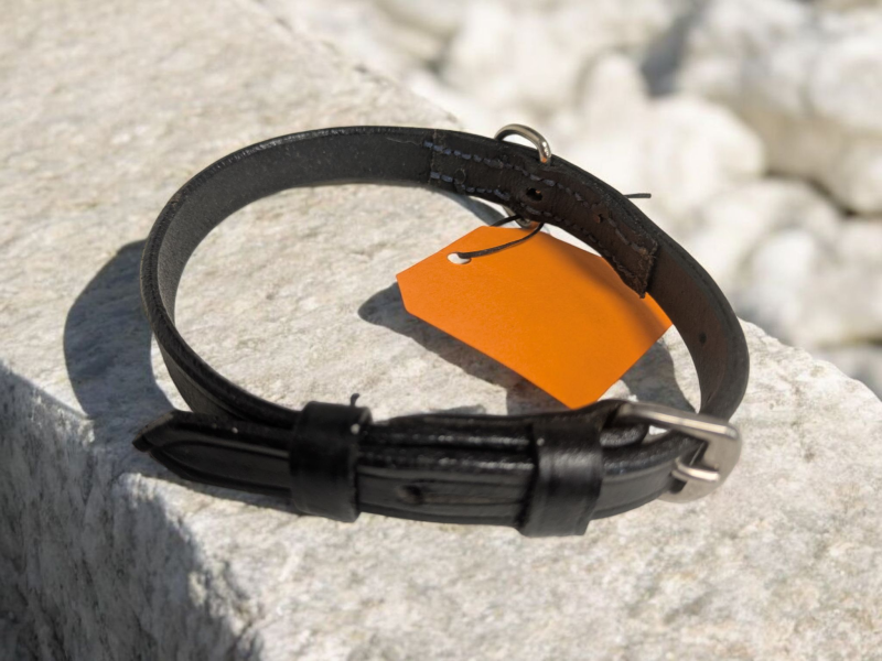 Made from a horse's cheekpiece bridle part. This dog collar is a slightly narrower width, approx 15mm wide. It is black leather, with hand stitched denim blue stitching and a stainless steel buckle. Bothe the buckle, and D ring are also repurposed bridle parts