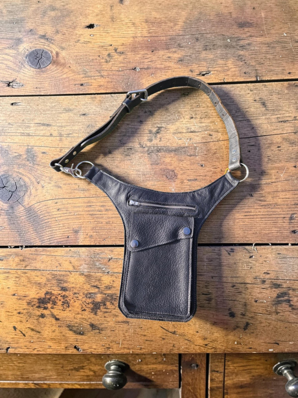 This versatile thigh bag could be worn around the waist or adjusted for under arm cross body use where security is a concern. Made of a soft black leather used for saddle panel construction. Silver coloured fittings. The belt is made from a repurposed stirrup leather